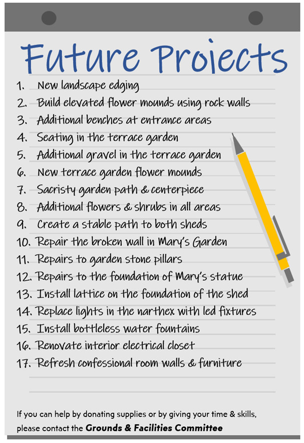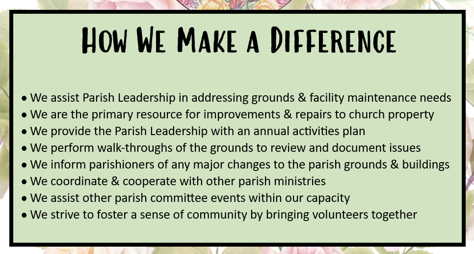 The Grounds & Facilities Committee work to maintain the parish’s buildings, gardens and surrounding property. Our primary responsibilities include: HVAC, Electrical, Plumbing, Safety, IT, Gardening & Rectory Maintenance.
